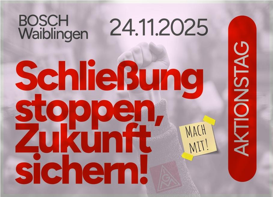Wir rufen Euch auf, am 24. November 2025 gemeinsam mit uns nach Waiblingen zu kommen. Als Region mit eigenen Bosch-Standorten stehen wir solidarisch an der Seite der Kollegen und Kolleginnen bei Bosch WaP – für den Erhalt des Standorts und gegen den drohenden Arbeitsplatzabbau.